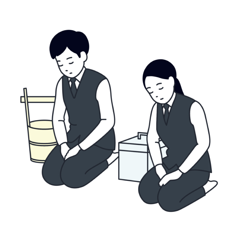専門のスタッフ『きよめびと』が2名~3名でお伺い致します。ご挨拶の後にご準備をさせて頂きます。ご準備は15分程度です。